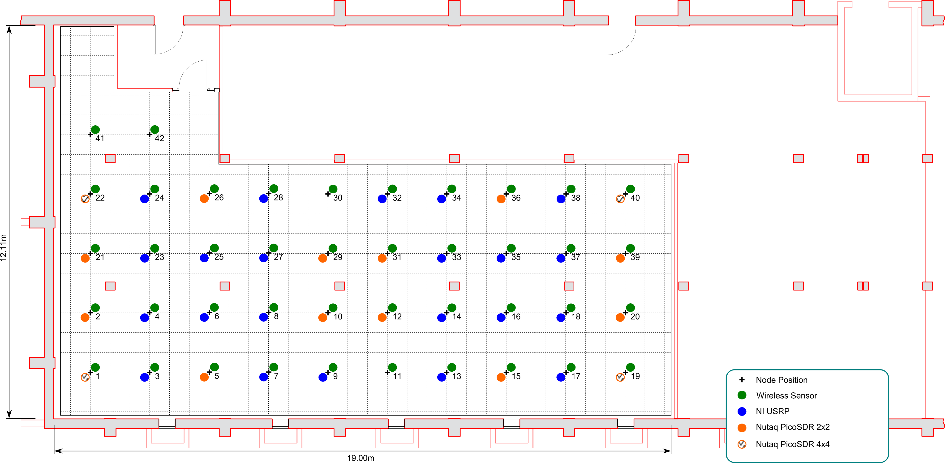 We need to adapt the scenario file to include the spectrum analyzer. We are using nodes 4 and 6 to do the OFDM transmission, and if we look at the Nodes Placement Map, we see that for example node 23 is a good candidate to execute the spectrum analyzer script.